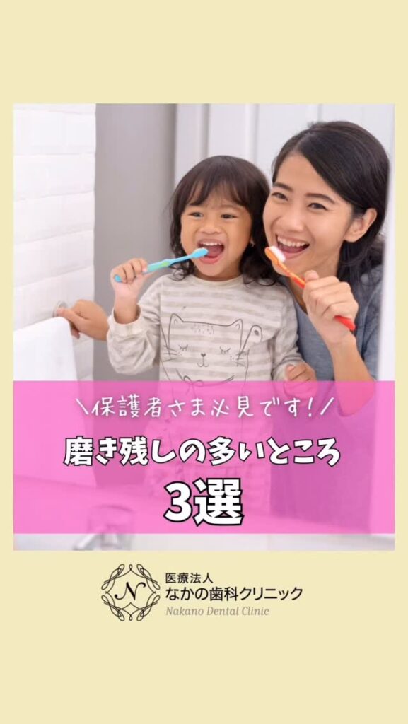 下の奥歯の舌側!舌の力が入ると磨きにくいので、仕上げ磨きの時は、舌の力を抜いてもらいましょう💡