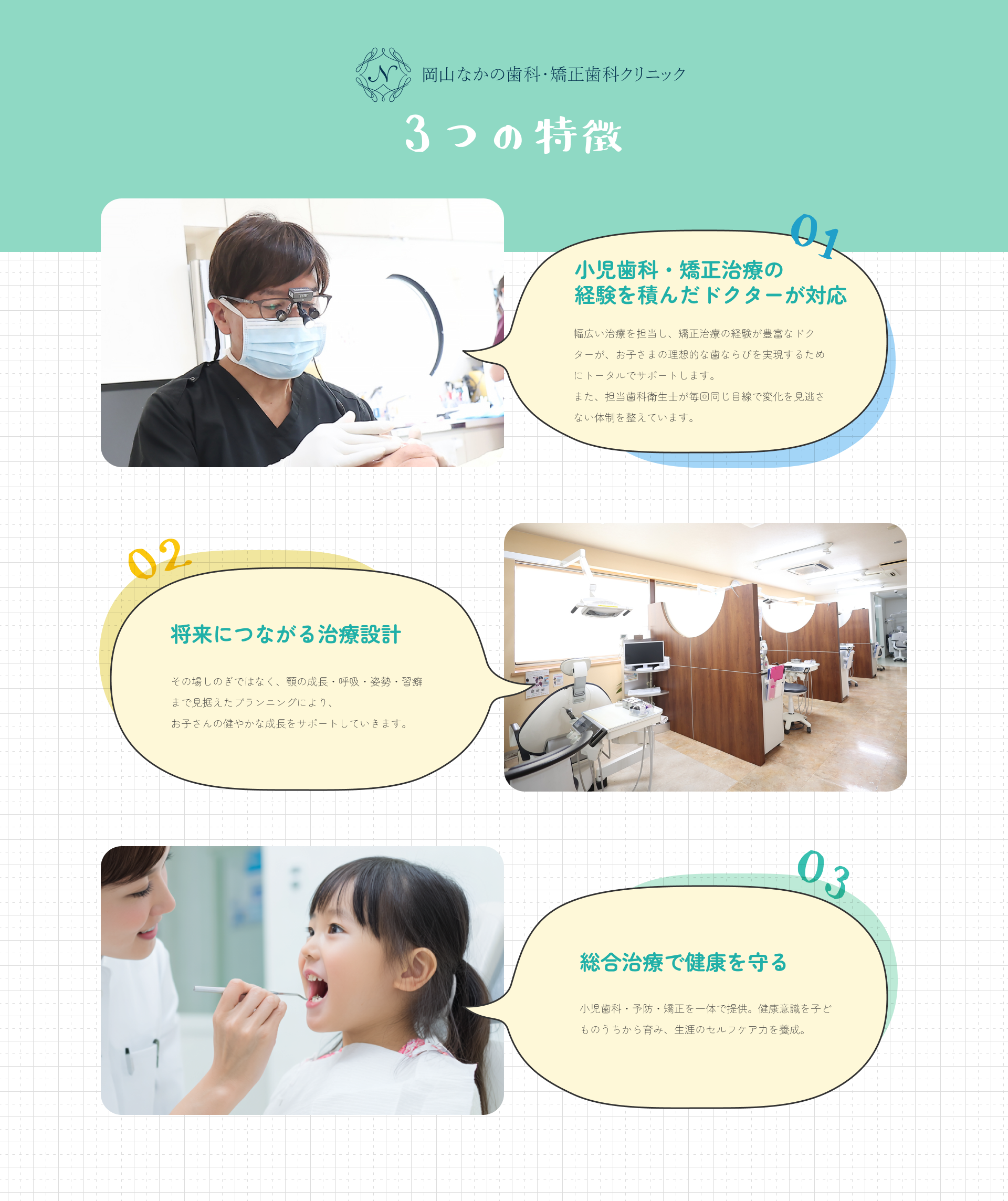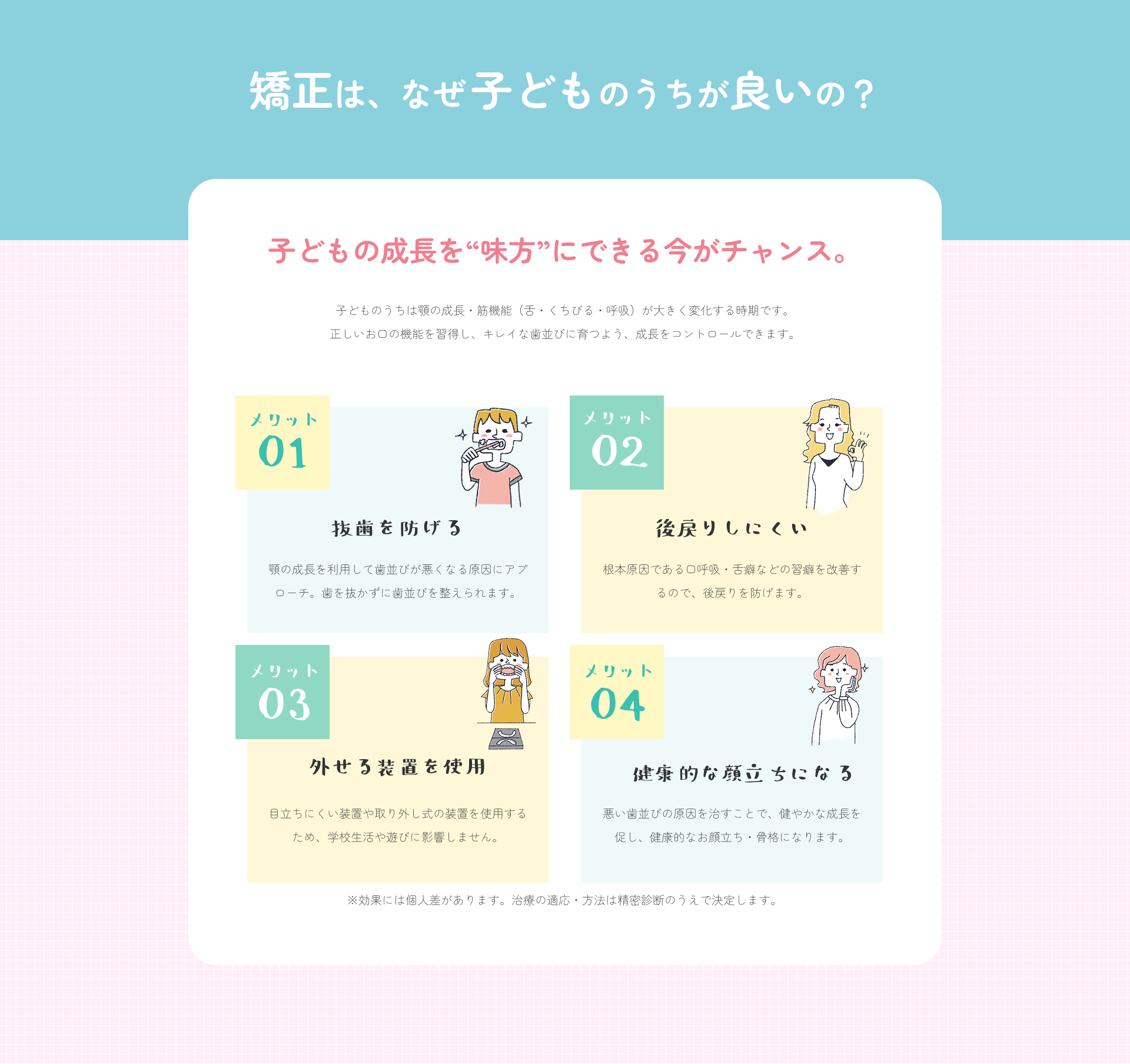 マウスピース型カスタムメイド矯正装置(インビザラインファースト®)を使った矯正治療は、歯並びや咬み合わせの改善だけでなく、顎の成長誘導を行う治療法です。