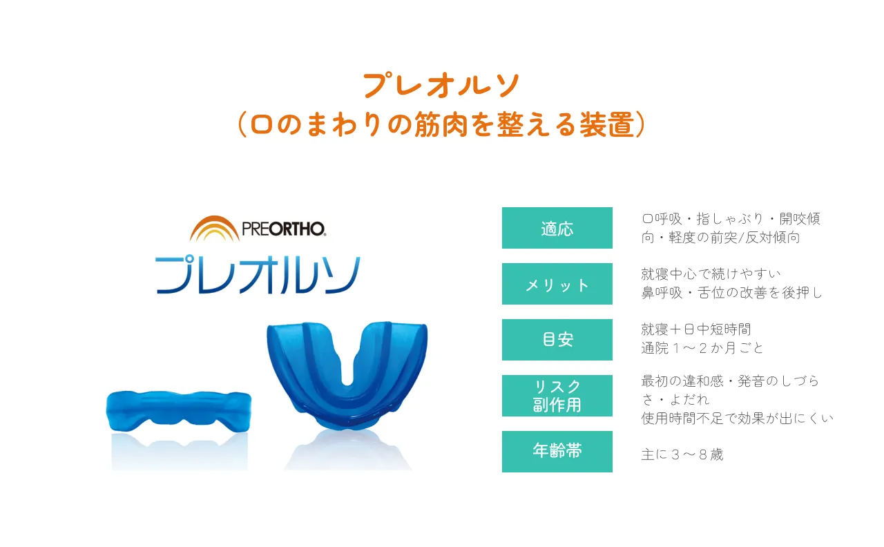 歯列矯正用咬合誘導装置(プレオルソ)は、歯を直接的に動かす一般的な矯正ではなく、